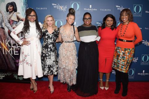 Ava DuVernay. Black woman with long brown locs wearing silver gown on red carpet standing in front of Oscar statues.