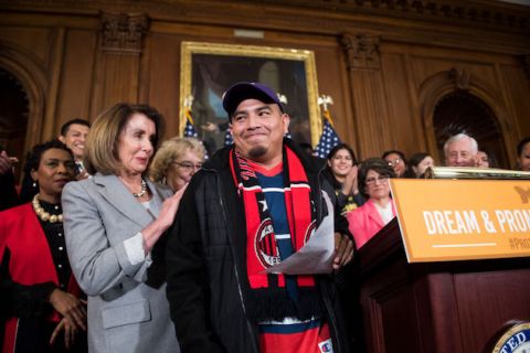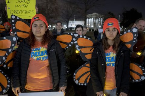 A woman with a long braid holds a sign that reads, "Protect Dreamers"