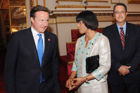 Toni-Ann Singh. Black beauty pageant sits with crown and sash in golden chair on stage.