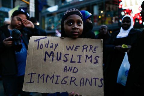 Muslim Ban. Muslim woman wearing brown headscarf and carrying a sign reading "We will not be banned"