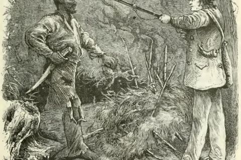 Nat Turner is shown being discovered in a wooded area of Virginia by a white man carrying a gun in 1831.
