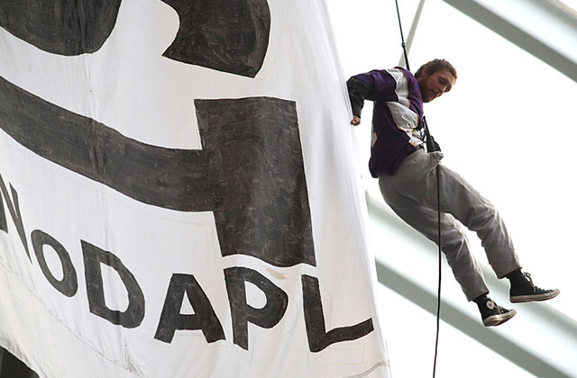 The Minneapolis Police Department arrested three supporters of the #NoDAPL movement on January 1. Two water protectors, 32-year-old Karl Mayo and 26-year-old Sen Holiday, climbed the rafters of the U.S. Bank Stadium around 12:47 p.m. CST during a Minnesota Vikings game against the Chicago Bears to drop a banner. “Divest,” it read—a direct message to U.S. Bank, which has reportedly invested $175 million toward the Dakota Access Pipeline project.