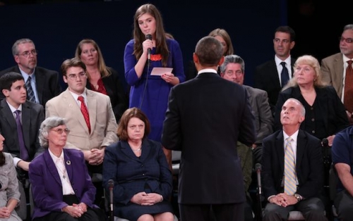 Candy Crowley, moderator of the town-hall style debate at Hofstra University, stated the rules and deployed a little aw-shucks banter to remind the candidates not to exceed their time limits. The first questioner, 20-year-old Jeremy Epstein, led with a boilerplate question about his ability to get a job after graduating from college, and both candidates trotted out their economic talking points. But a few questions in, the proceedings became unpredictable. Here’s how: