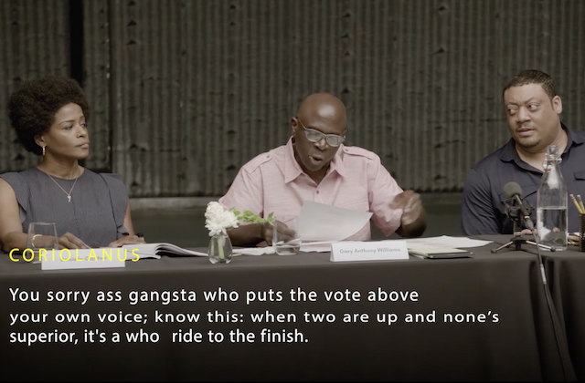 Williams reads the part of Coriolanus, who Shakespeare envisioned as a vengeance-seeking Roman military general with political ambitions. "Seeing how he was trying to mix Shakespeare with some street language—when you have the words 'Chill, mama,' trying to be followed by some iambic pentameter, it's magic coming out of your mouth," Williams, who previously acted with the Georgia Shakespeare Festival, said about the dialogue. "I didn't say good magic," he adds.