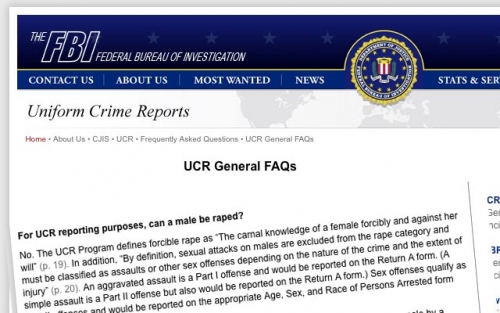 The current definition, which I’ve cited in this space multiple times and will continue to do so because it’s just so ridiculous, is, “The carnal knowledge of a female forcibly and against her will.” Further, in its FAQs, the FBI has helpfully clarified that, “By definition, sexual attacks on males are excluded from the rape category and must be classified as assaults or other sex offenses depending on the nature of the crime and the extent of injury.”