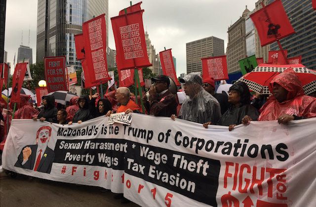 Yesterday (May 23), Fight for $15 organized members of more than a dozen groups for a March on McDonald’s in Chicago. Participants included organizers with the Movement for Black Lives, Color of Change and the Women’s March. They gathered outside Trump Tower, then marched to flagship location Rock N Roll McDonald’s carrying a banner that read, “McDonald’s: The Trump of Corporations.” The protest continued this morning (May 24), outside the company’s Oak Brook, Illinois, headquarters where shareholders gathered for their annual meeting.