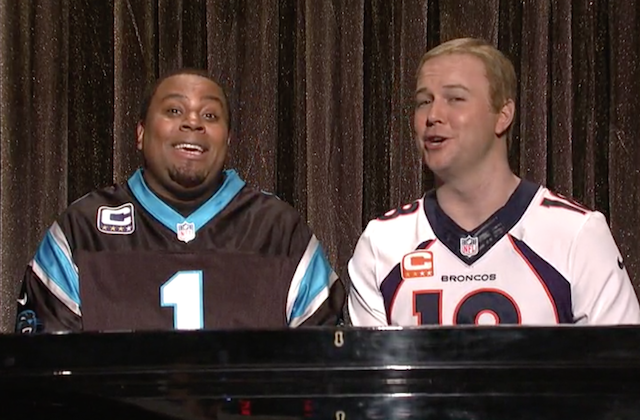 Newton (played by Kenan Thompson) and Denver Broncos QB Peyton Manning (played by Taran Killam) sang a version of "Ebony and Ivory," like Stevie Wonder (Eddie Murphy) and Frank Sinatra (Phil Hartman) before them. This version highlighted the hate directed at the young Black QB, the lack of criticism leveled at Manning and the movie "Concussion." It ended, perhaps expectedly, with Newton dabbing—which prompted cops to "save" Manning.
