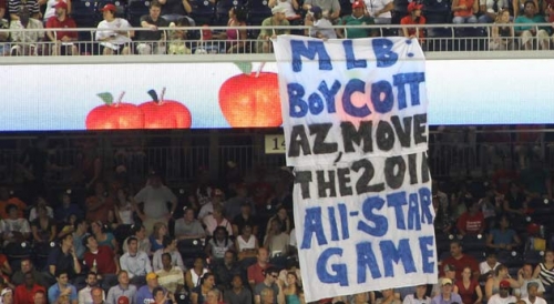 On Monday, protestors amassed a block away from the MLB's hotel for tonight's All-Star Game. They claimed to have over 100,000 signed petitions asking Commissioner Bud Selig to relocate next year's game to a more brown-friendly state.